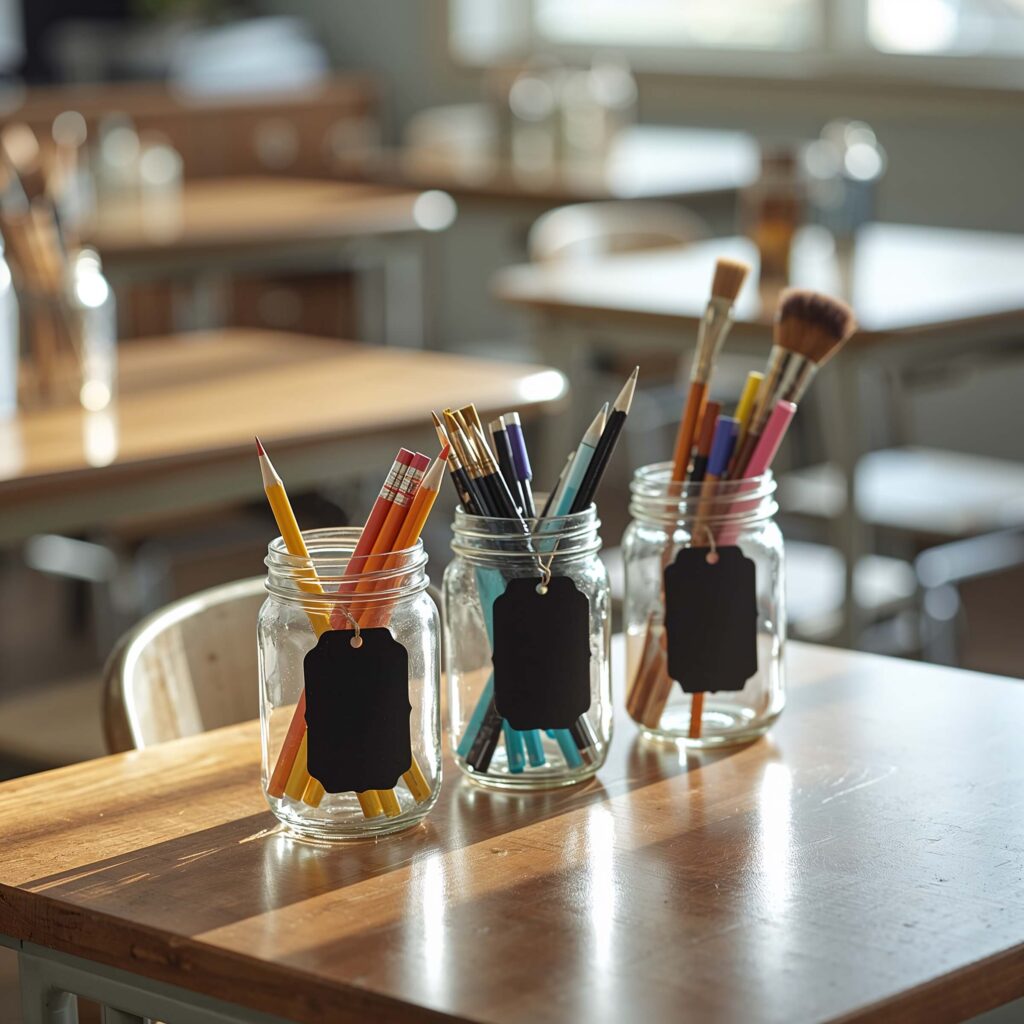 Label each jar with chalkboard paint strips or cute farmhouse-style tags. Group supplies by activity type rather than just throwing all writing implements together. One jar for regular pencils, another for colored pencils, a third for special art supplies—you get the idea.