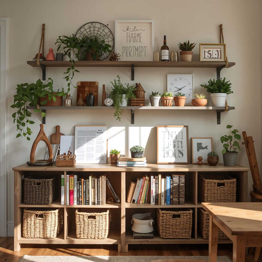 I installed my first set after running out of surface space for displaying student projects. These shelves now hold everything from small potted plants (fake ones, because let’s be realistic) to rotating displays of student work. The rope adds movement and visual interest that fixed shelves can’t provide.