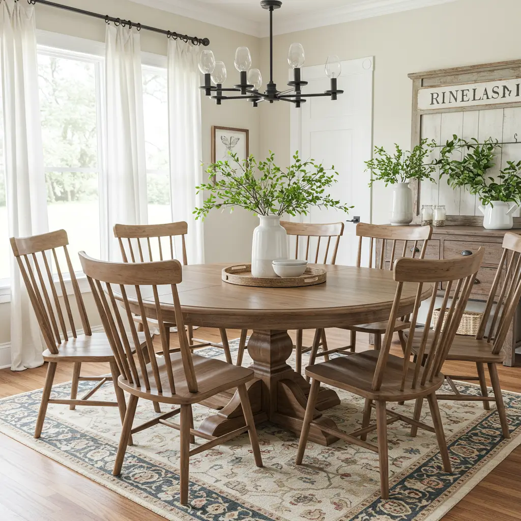 Round tables eliminate the hierarchy of head-of-table seating, which fits perfectly with farmhouse style’s democratic spirit. My friend’s round farmhouse table creates this intimate bubble where everyone feels equally included in conversations.