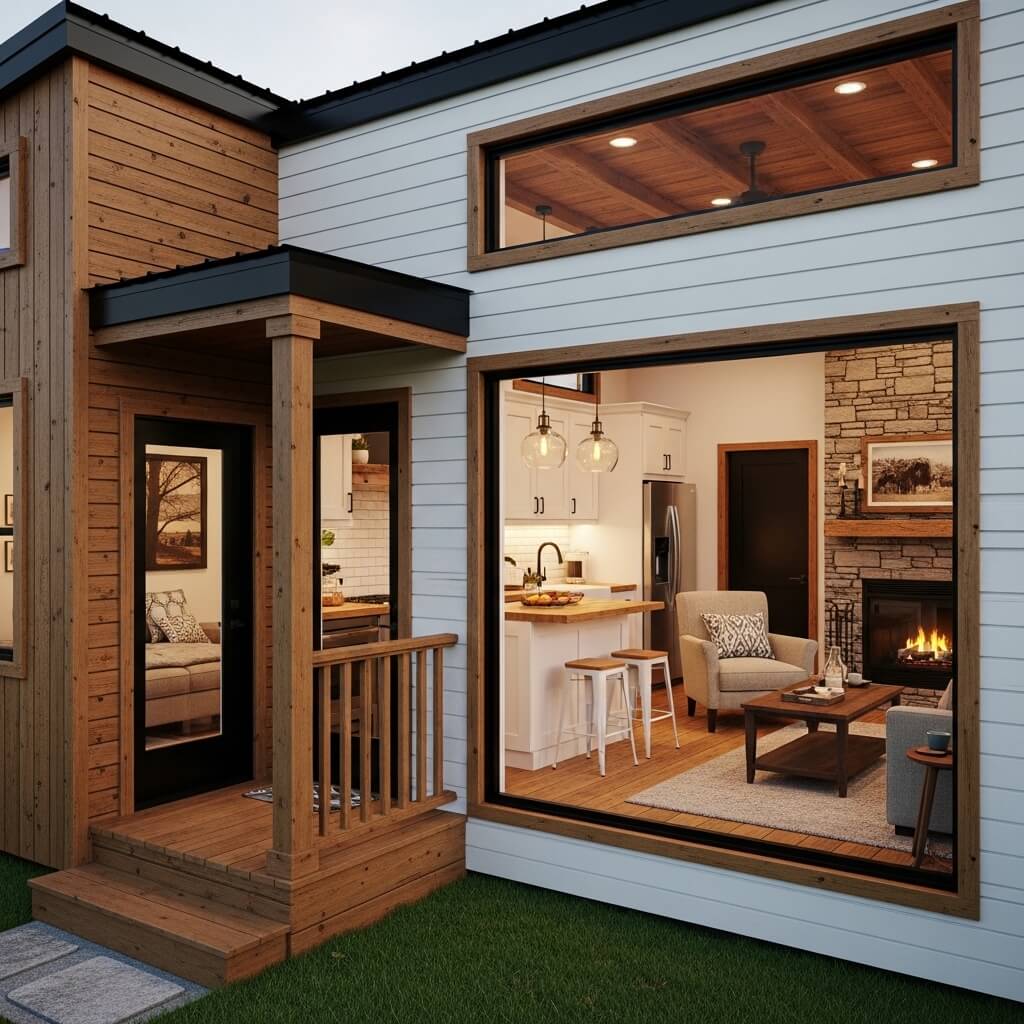 The electric fireplace below adds warmth without the hassle of traditional wood-burning fires. It’s a practical choice for modern living, providing both comfort and style. Pairing it with rustic elements like a cozy chair or braided rugs enhances the inviting atmosphere.