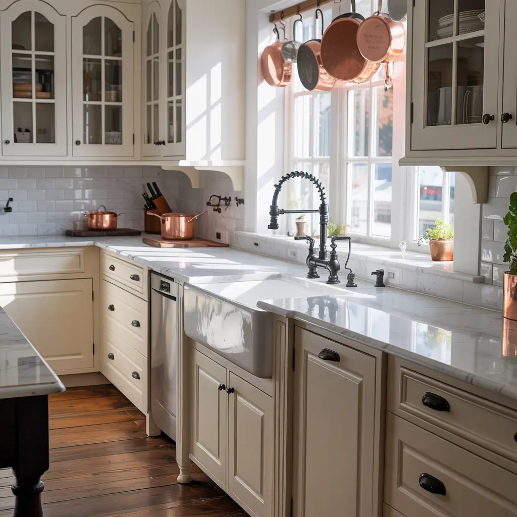 The temperature contrast between cool marble and a warm farmhouse sink creates this beautiful tension. Add some vintage brass fixtures and suddenly your kitchen feels like it belongs in a French château. Who wouldn’t want that?