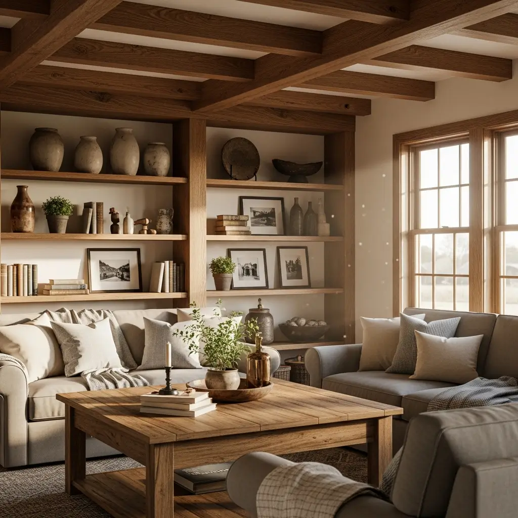 Wood in a farmhouse living room is like salt in cooking – you need it, but the amount and type make all the difference. Natural wood accents bring warmth and authenticity that no amount of painted furniture can match.