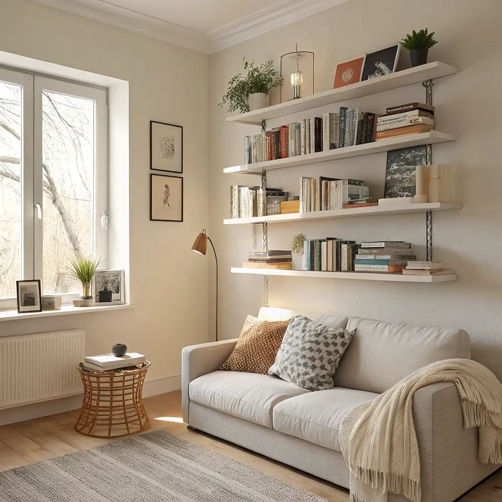 Corner floating shelves are absolute game-changers for small spaces. They utilize that weird corner space that usually just collects dust bunnies and make it functional. Plus, books arranged in corners create this cozy, library-nook feeling that makes small spaces feel intentional rather than cramped.