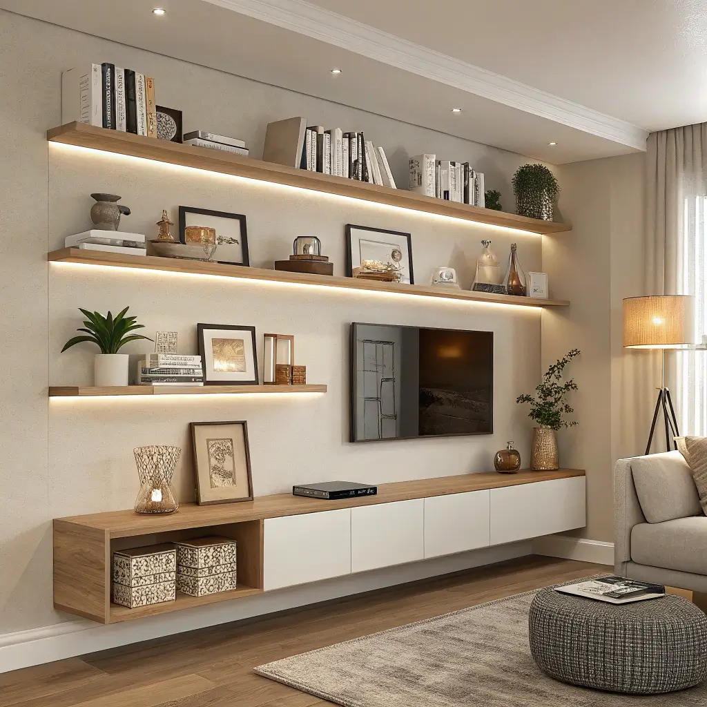 LED strip lights are the easiest to integrate, running along the underside of shelves to create a warm glow. Some floating shelves come with channels built in for light strips, making installation clean and cord-free.