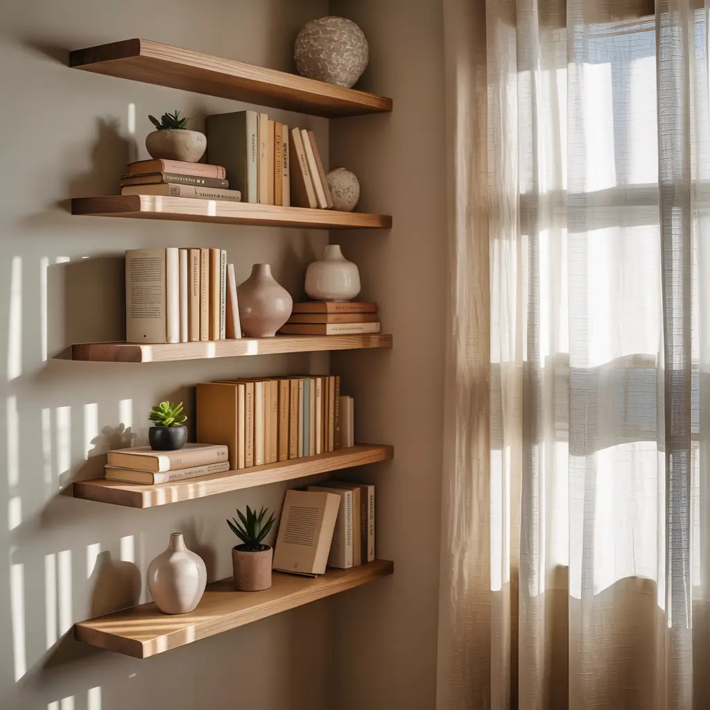 Corner shelves create natural book nooks that beg for cozy styling. Add a small lamp on one shelf to create a reading spotlight. Mix vertical and horizontal book arrangements to add visual interest from both angles.