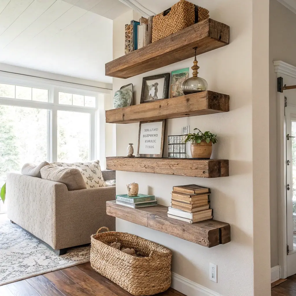 Creating rustic floating shelves is surprisingly straightforward. Cut your wood to size, sand it smooth (but not too smooth—you want some texture), apply your chosen stain or finish, and attach heavy-duty floating shelf brackets. The brackets should be rated for at least 50 pounds per shelf for book storage.