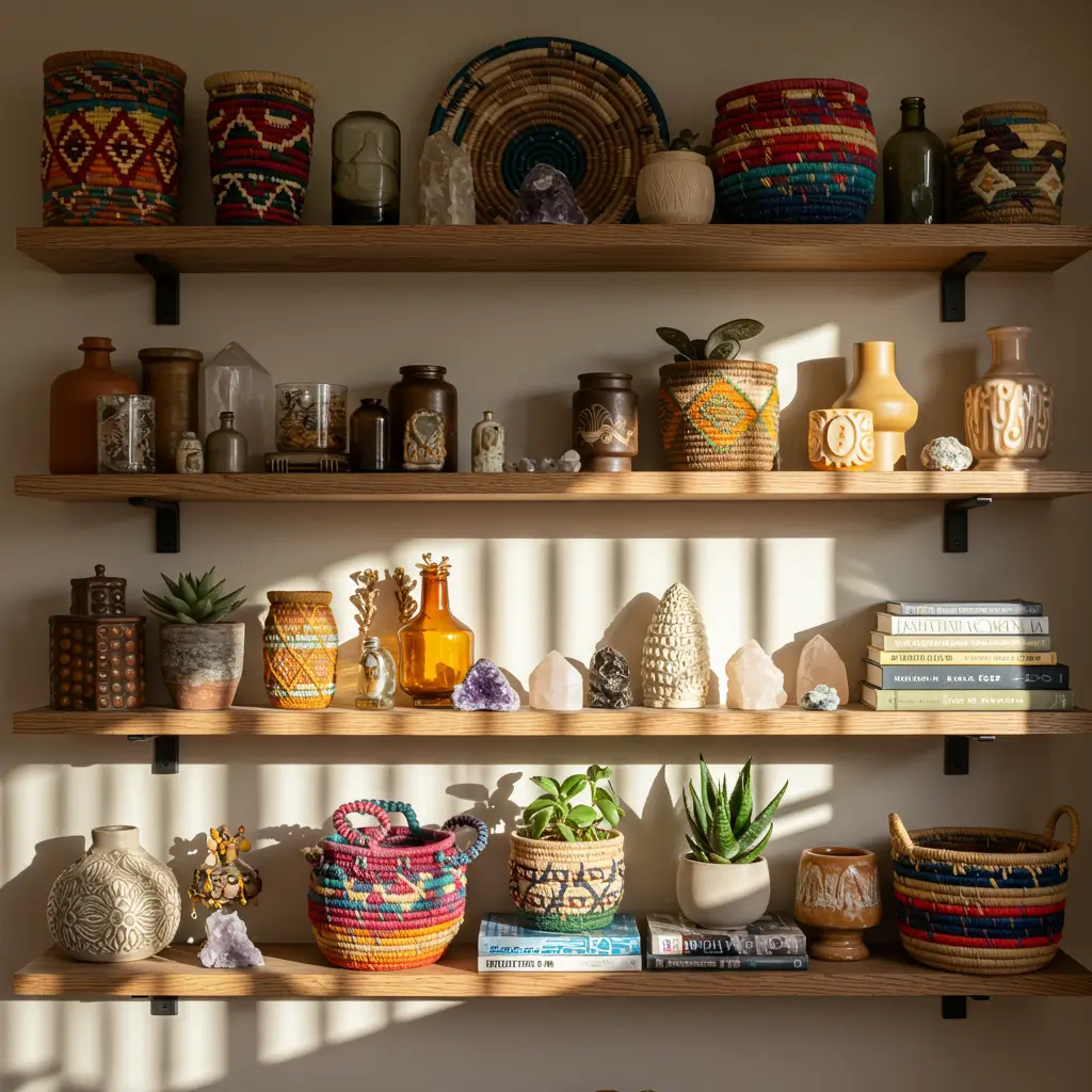 Use a consistent color palette even while mixing styles. My boho shelves stick to earthy tones with pops of teal and coral. The color consistency unifies different elements.