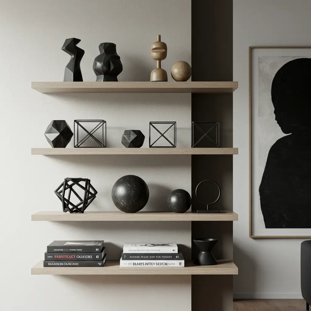 Keep the color palette limited and sophisticated. Black, white, brass, and maybe one accent color. My geometric shelf uses only these colors, creating a cohesive modern look.