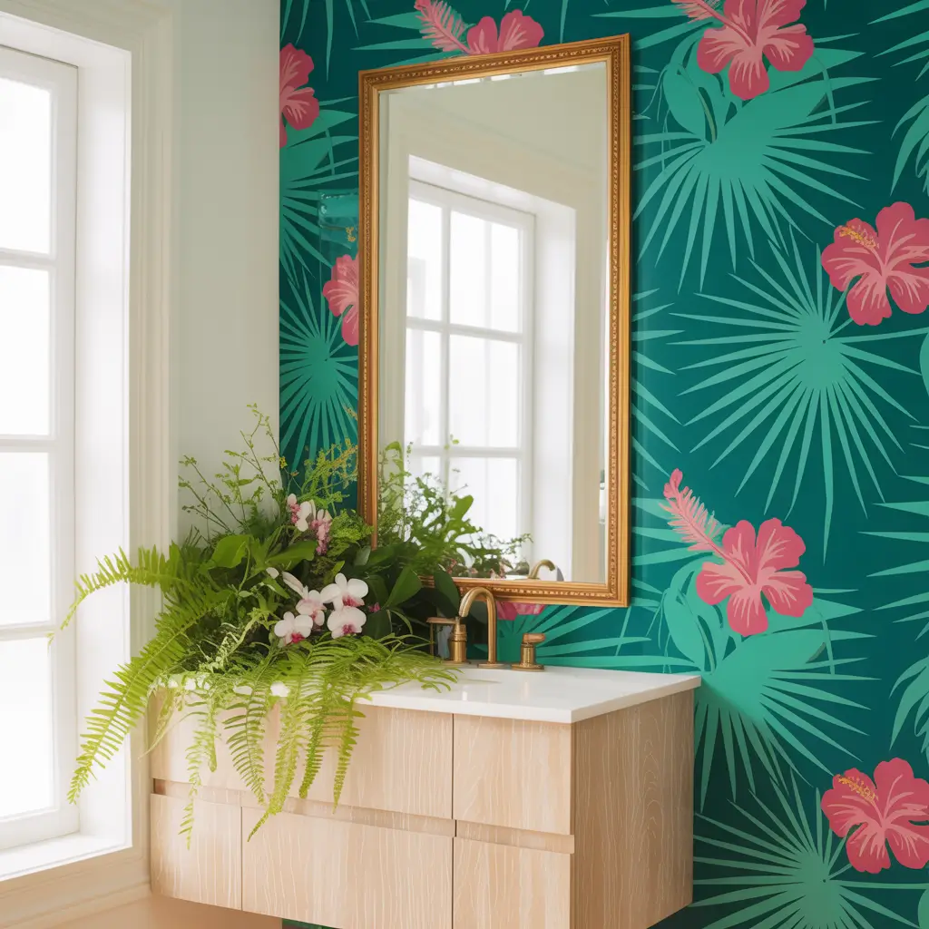 I’ve noticed that tropical patterns work incredibly well in windowless bathrooms. They bring that outdoor energy inside, making even the tiniest powder room feel alive and vibrant. Choose patterns featuring monstera leaves, birds of paradise, or hibiscus flowers for maximum impact.