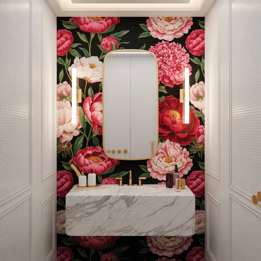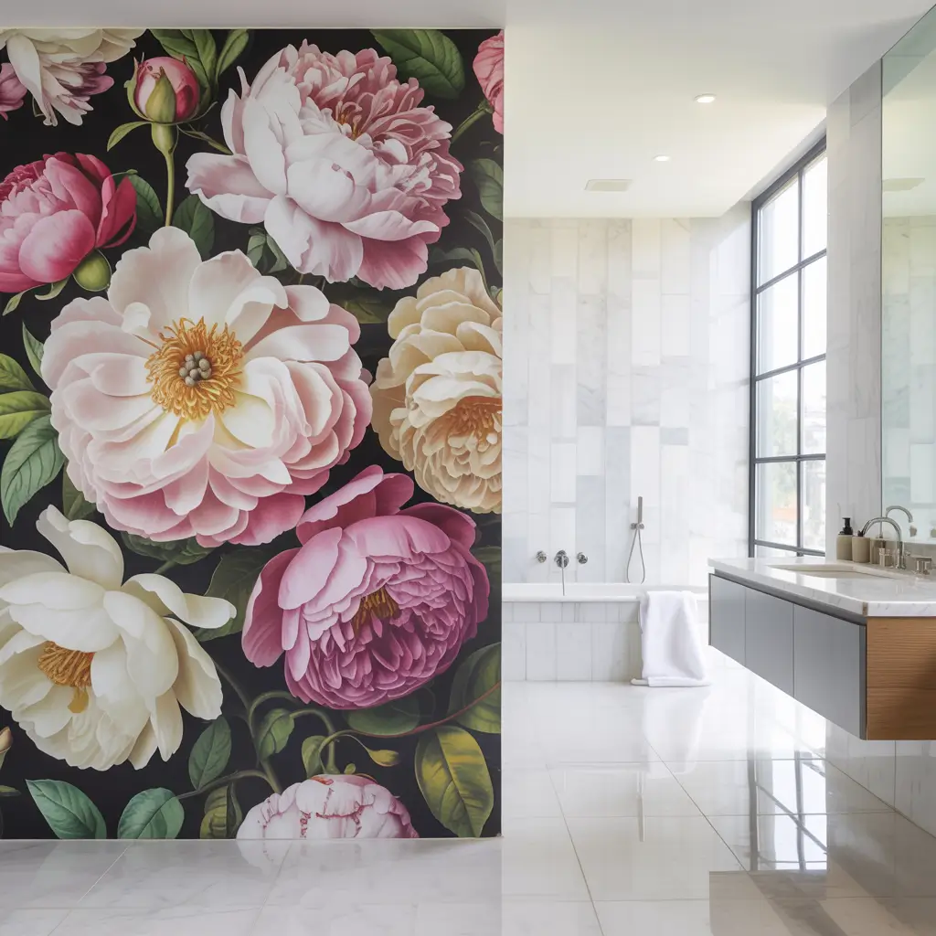 Creating an accent wall with oversized peonies transforms your bathroom from functional to fabulous. Pick the wall behind your vanity or the one you see first when entering. This becomes your bathroom’s focal point, the thing people remember.