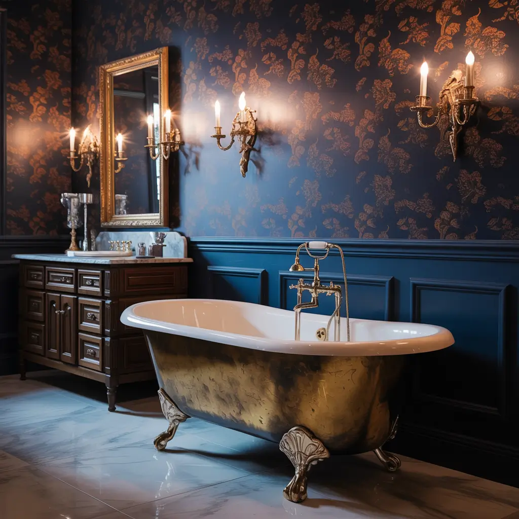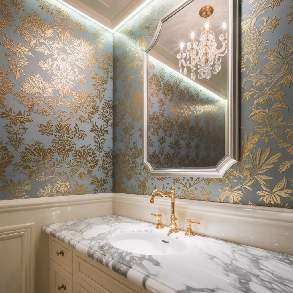 The secret to pulling off gold and florals lies in restraint. You’re going for elegant, not Vegas casino bathroom. Choose wallpapers where gold appears as an accent – perhaps outlining petals or creating subtle shimmer in the background.