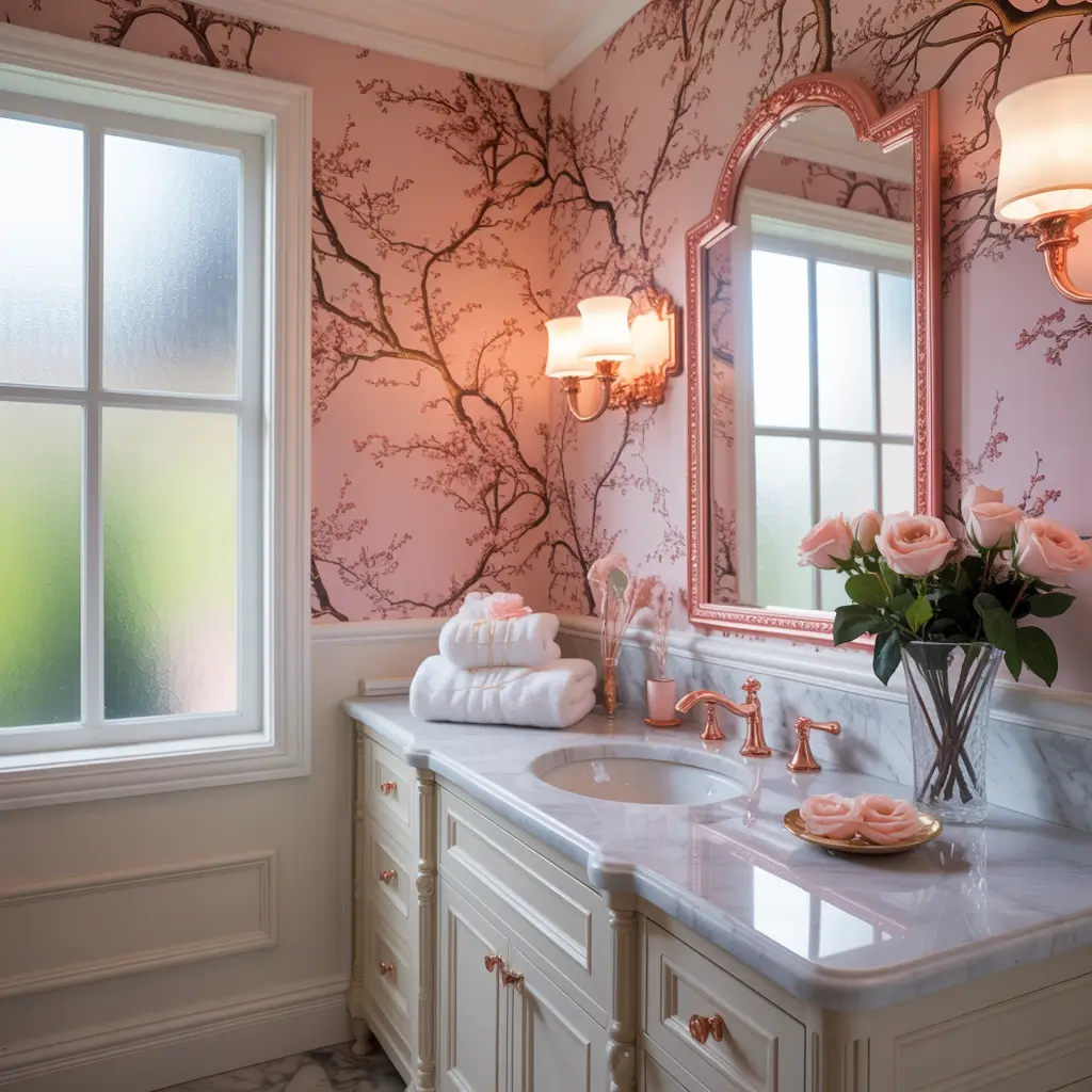 I installed rose gold metallic roses in my powder room, and now it’s become the bathroom everyone wants to use at parties. The way light plays off those metallic accents at different times? Pure magic.