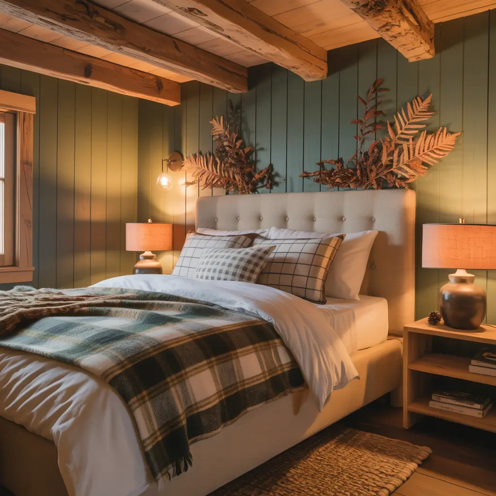 My weekend cabin bedroom features forest green walls with rough-hewn wood beams, plaid bedding, and vintage outdoor-themed artwork. The deep green makes the natural wood pop while creating that cozy, nestled-in-the-woods feeling. Add a vintage quilt and some antlers (fake ones work!), and you’ve got instant cabin vibes without leaving the suburbs.