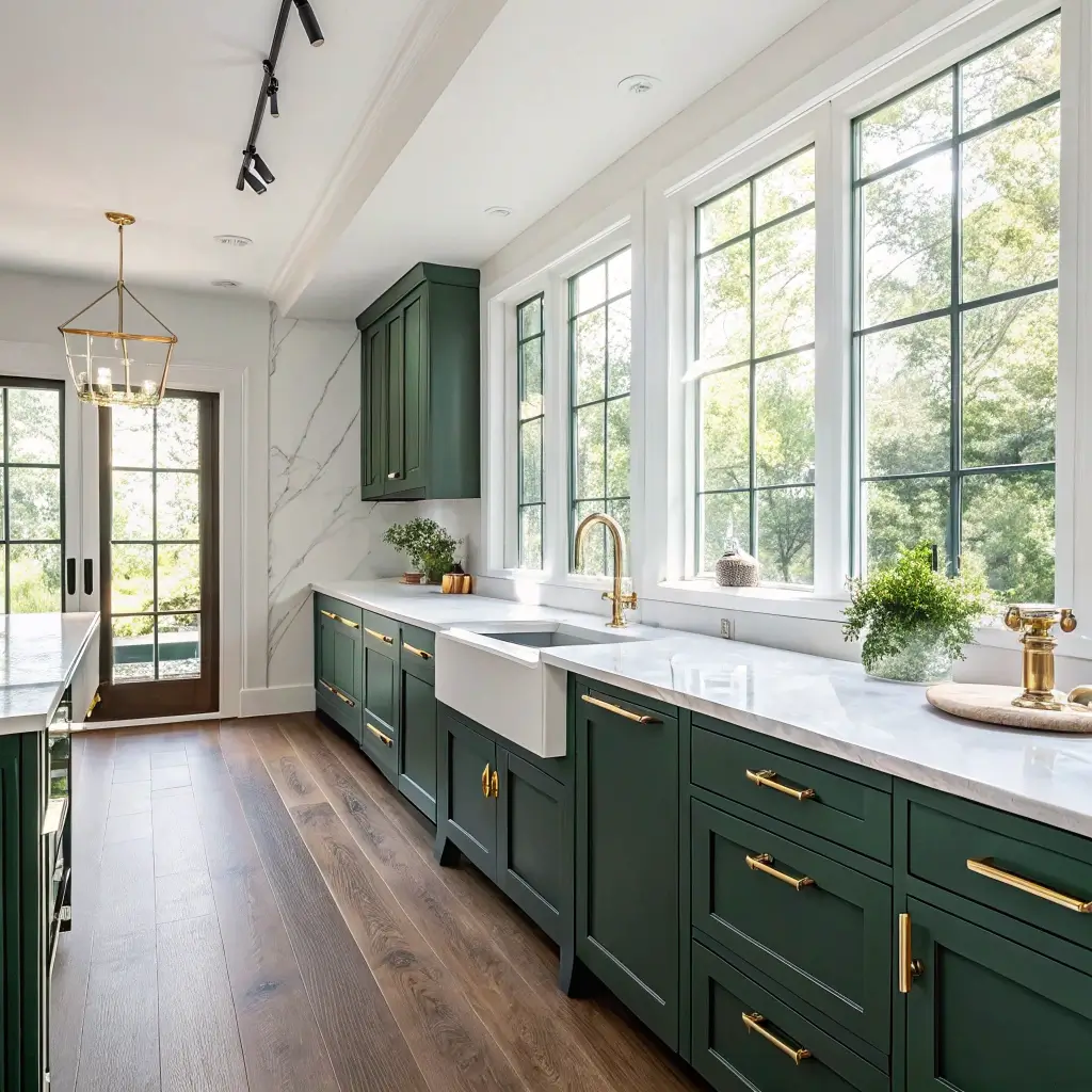 Position your forest green cabinets to take advantage of windows. Morning light makes the green look fresh and alive. Evening light turns it moody and intimate. The color literally changes throughout the day, giving you multiple kitchens in one.
