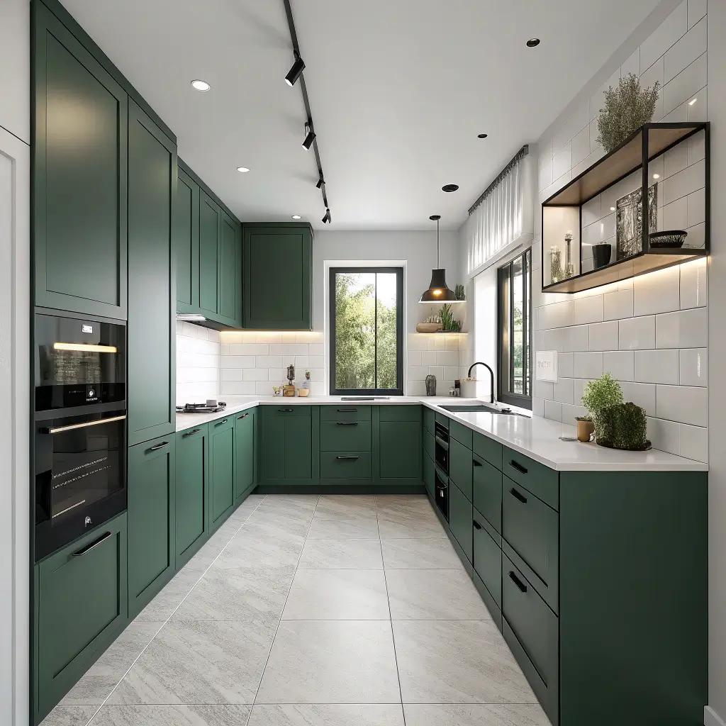 Forest green works in minimalist kitchens because it becomes the statement—no need for excessive decor or busy patterns. Choose flat-panel cabinet doors, skip the ornate hardware, and let that gorgeous green do all the talking. The color itself becomes the design element.