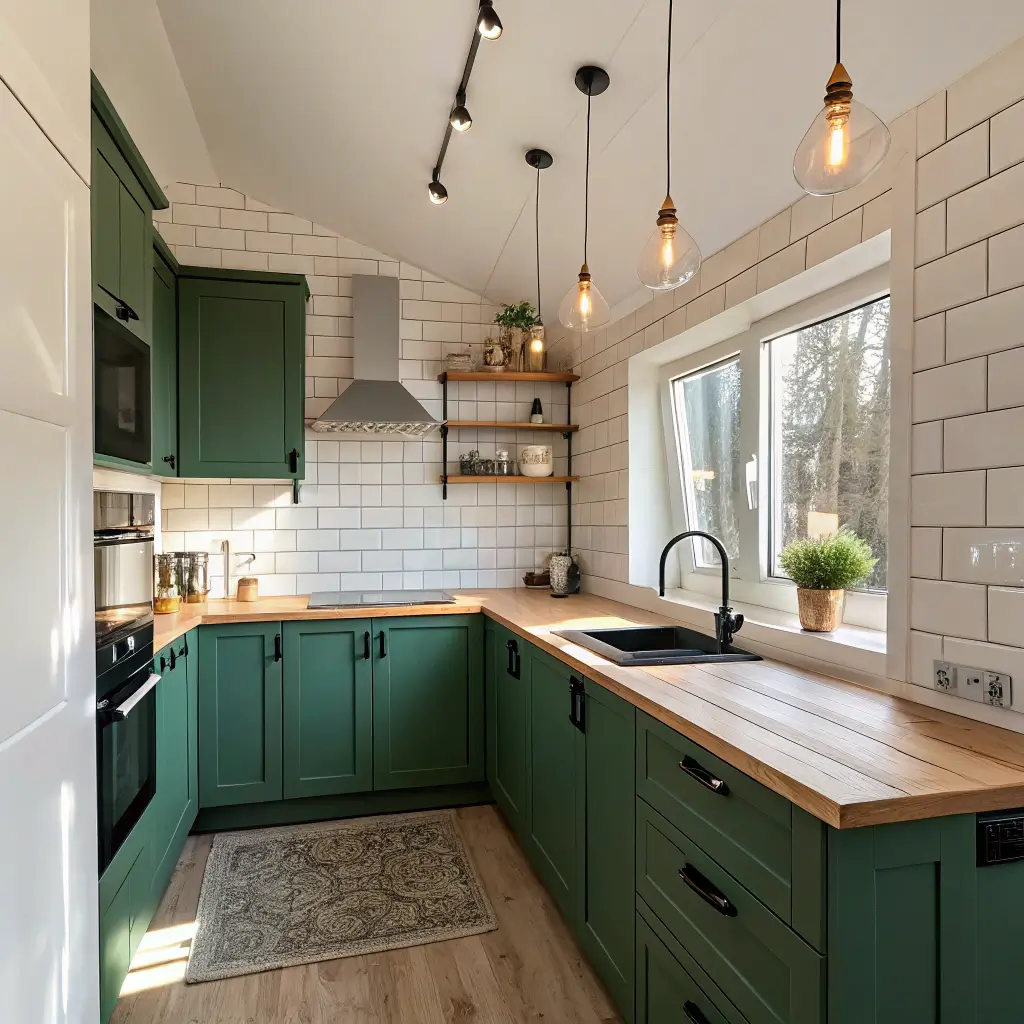 Small kitchens handle bold choices better because there’s less repetition. Your forest green becomes the star feature, not overwhelming sameness.