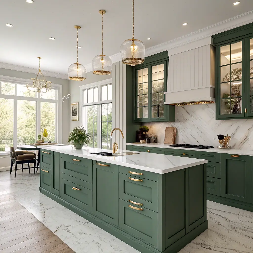 5. Forest Green Cabinets with Gold Hardware Accents
