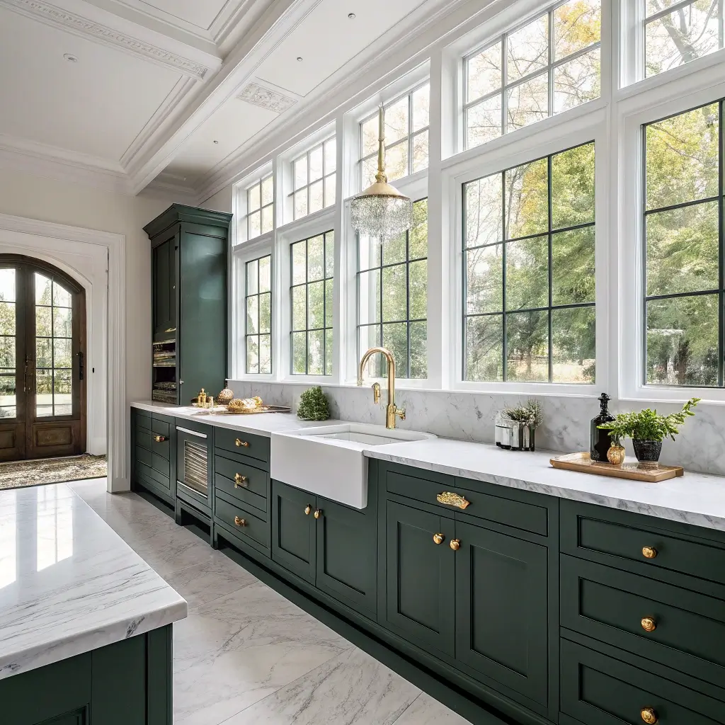 The deep, moody green grounds the space while white marble adds brightness and movement. Those natural veins in the marble echo organic patterns found in nature, making the forest green feel even more connected to the outdoors. It’s like bringing a fancy forest clearing into your kitchen, minus the bugs and unpredictable weather.