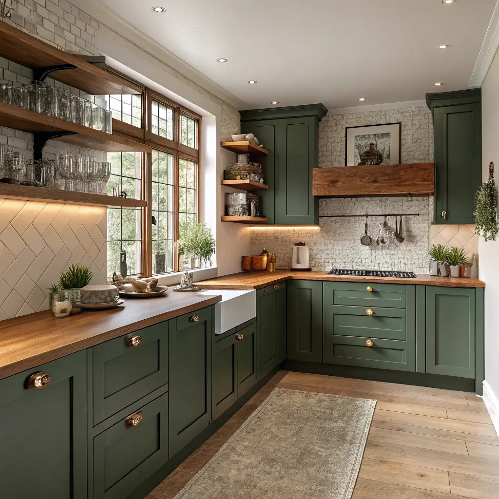 Breaking up forest green cabinets with open shelving creates visual breathing room while maintaining drama. This combination prevents the green from feeling heavy while adding display opportunities for your prettiest kitchen items.