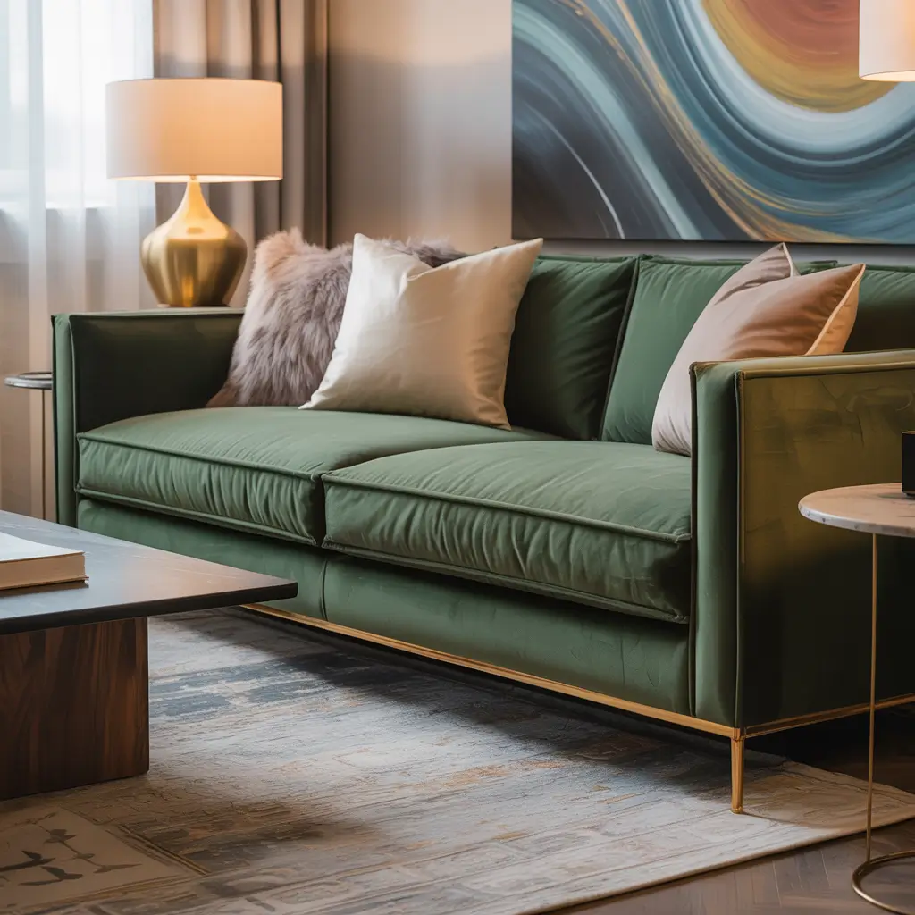 - Velvet sofa with linen pillows