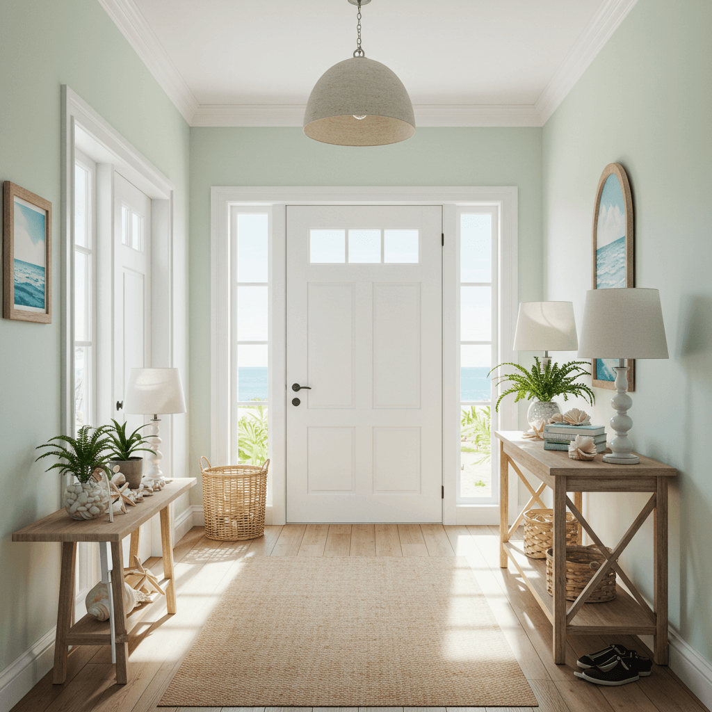 Lighting for coastal foyer areas: The coastal look depends on light — both natural and artificial. Use warm white LED bulbs (2700K to 3000K) in any fixtures to replicate the quality of warm afternoon light. A simple rattan or woven pendant in the foyer fits the aesthetic perfectly while adding texture overhead. Avoid cool white or daylight bulbs — they make a coastal palette look clinical rather than breezy.
