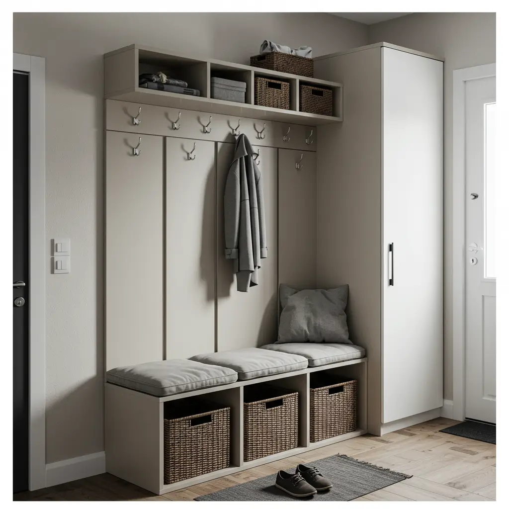 - Built-in cubbies with doors or baskets to hide shoes