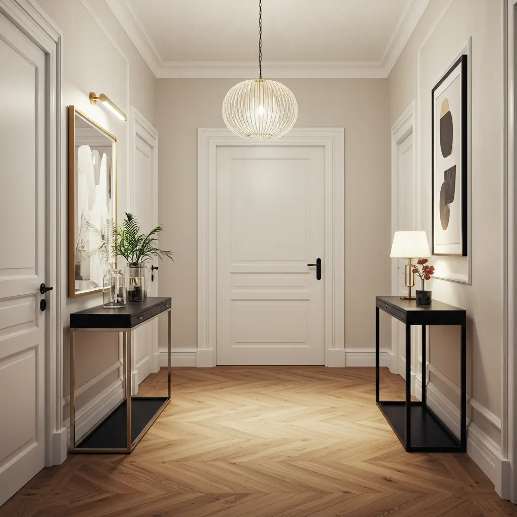 If you’re renovating, consider your foyer flooring as a genuine design opportunity. Patterned tile in a modern geometric layout can become the focal point of the entire space — and it grounds every other design decision you make. Even in a rented space, a geometric rug over plain flooring achieves a similar effect at a fraction of the cost.