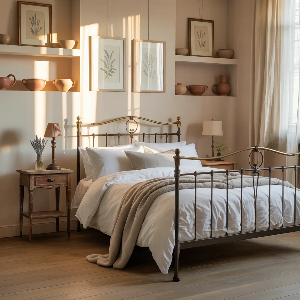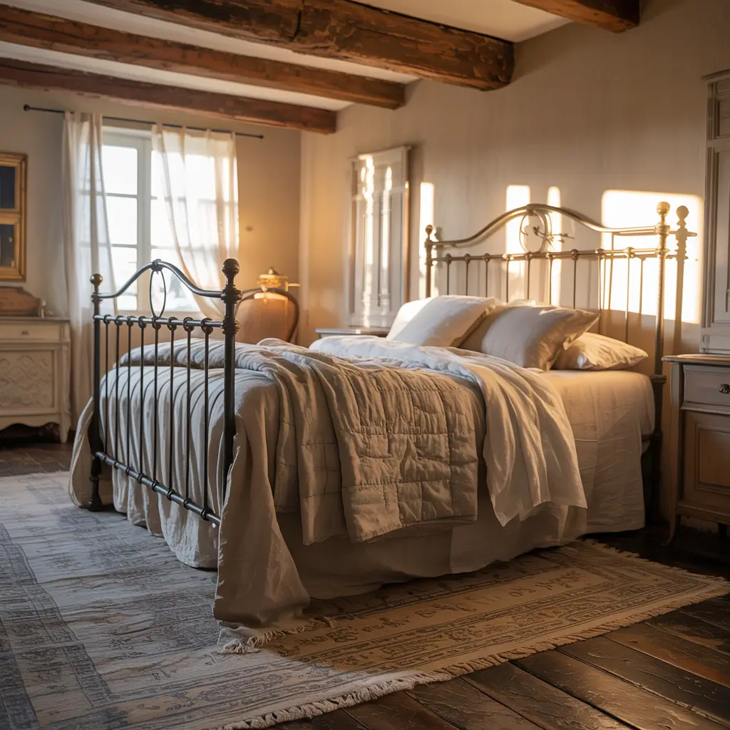 Wood furniture takes center stage, but we’re not talking sleek and modern. Distressed finishes tell a story—like that armoire has been passed down through generations (even if you grabbed it at a flea market last weekend). Layer in wrought iron accents, maybe a vintage metal bed frame, and you’re golden.