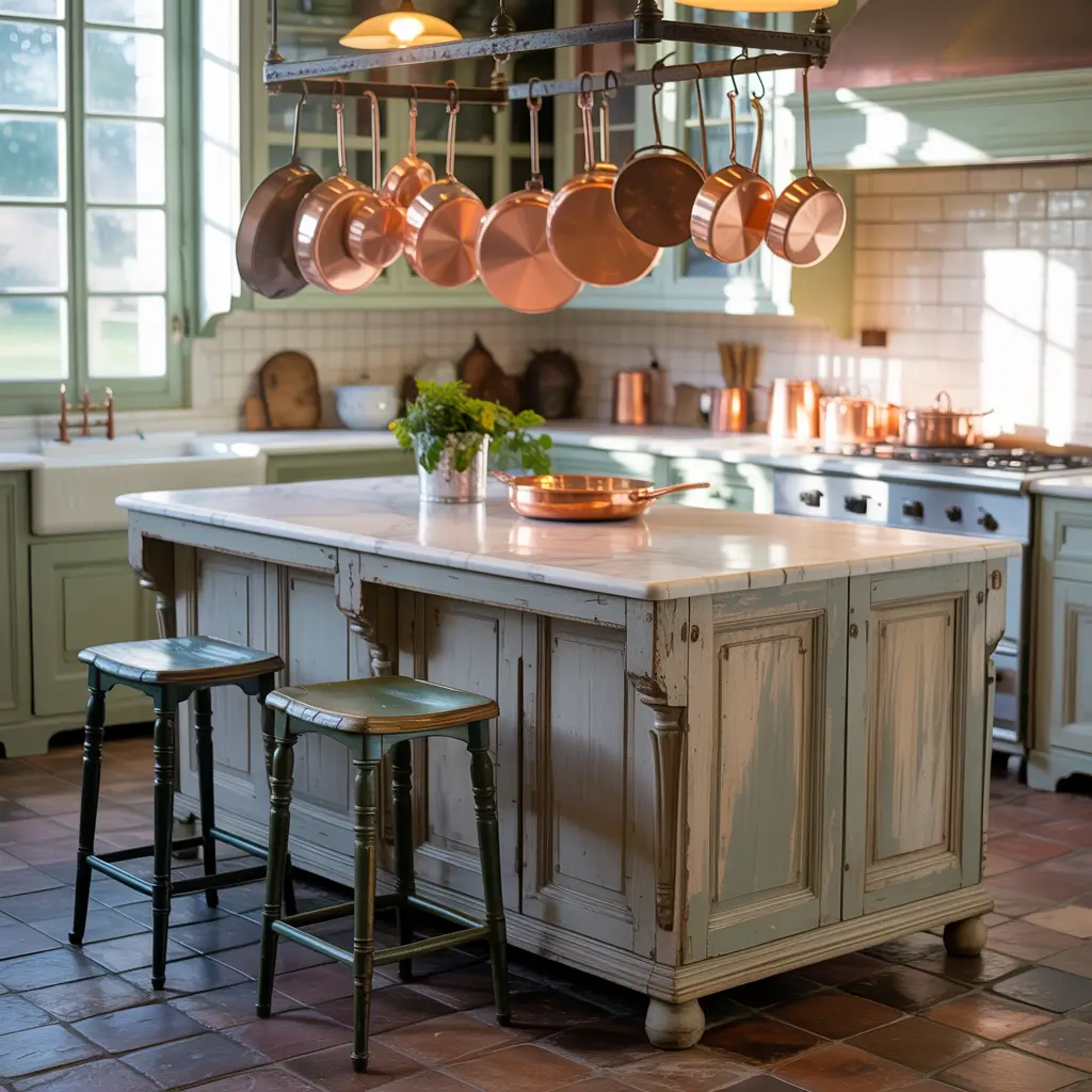 A kitchen island anchors your entire space, and in a farmhouse kitchen, it should look like it’s been there forever. Repurposed furniture makes the best islands – old farm tables, vintage store counters, or even antique dressers can be transformed into functional centerpieces.