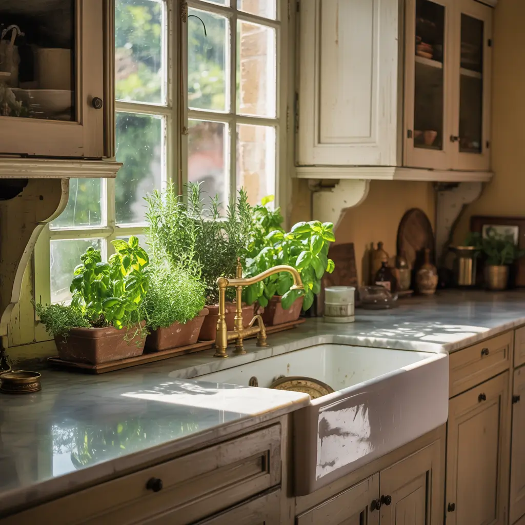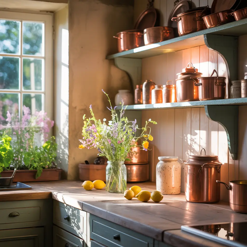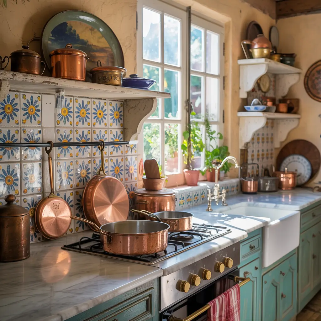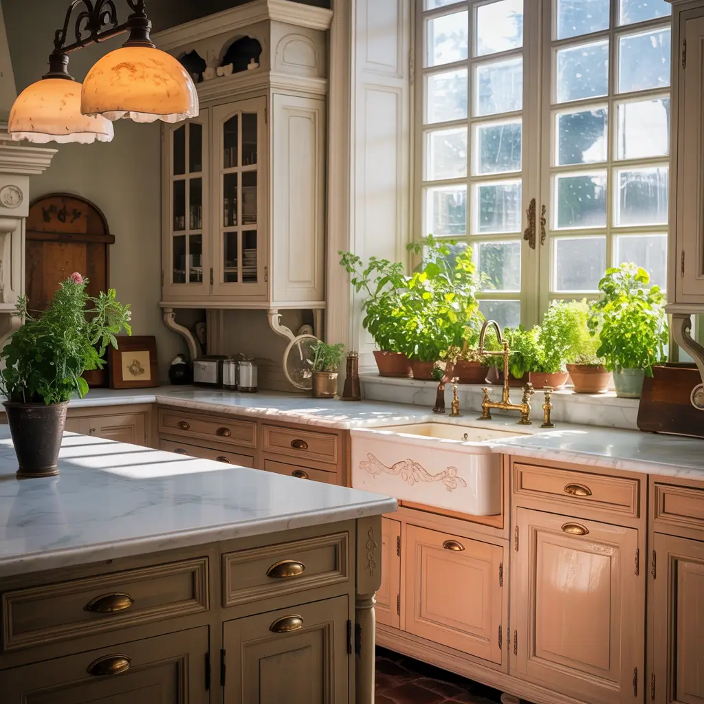 Small appliances matter too. Hide that neon-blue Keurig and display a vintage-inspired stand mixer instead. Store modern necessities in vintage containers – coffee pods in glass jars, utensils in vintage crocks. The goal? Make modern convenience invisible while vintage charm takes center stage.