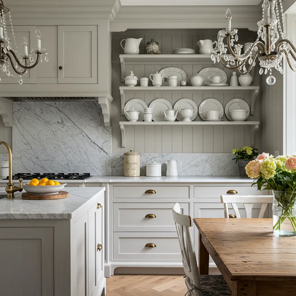 - Soft grey cabinets with marble