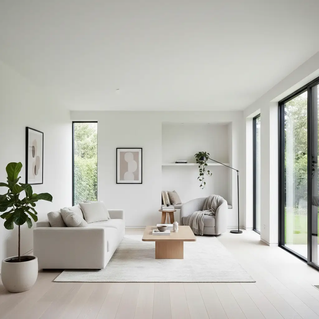 Living spaces: Light wood floors, white walls, simple furniture with clean lines, cozy textiles, minimal accessories