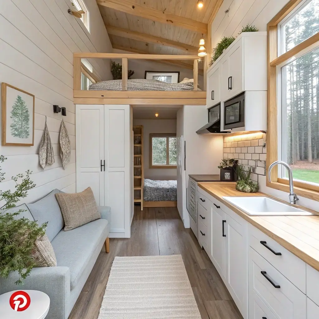 - Bedrooms: Platform beds, built-in storage, limited decor