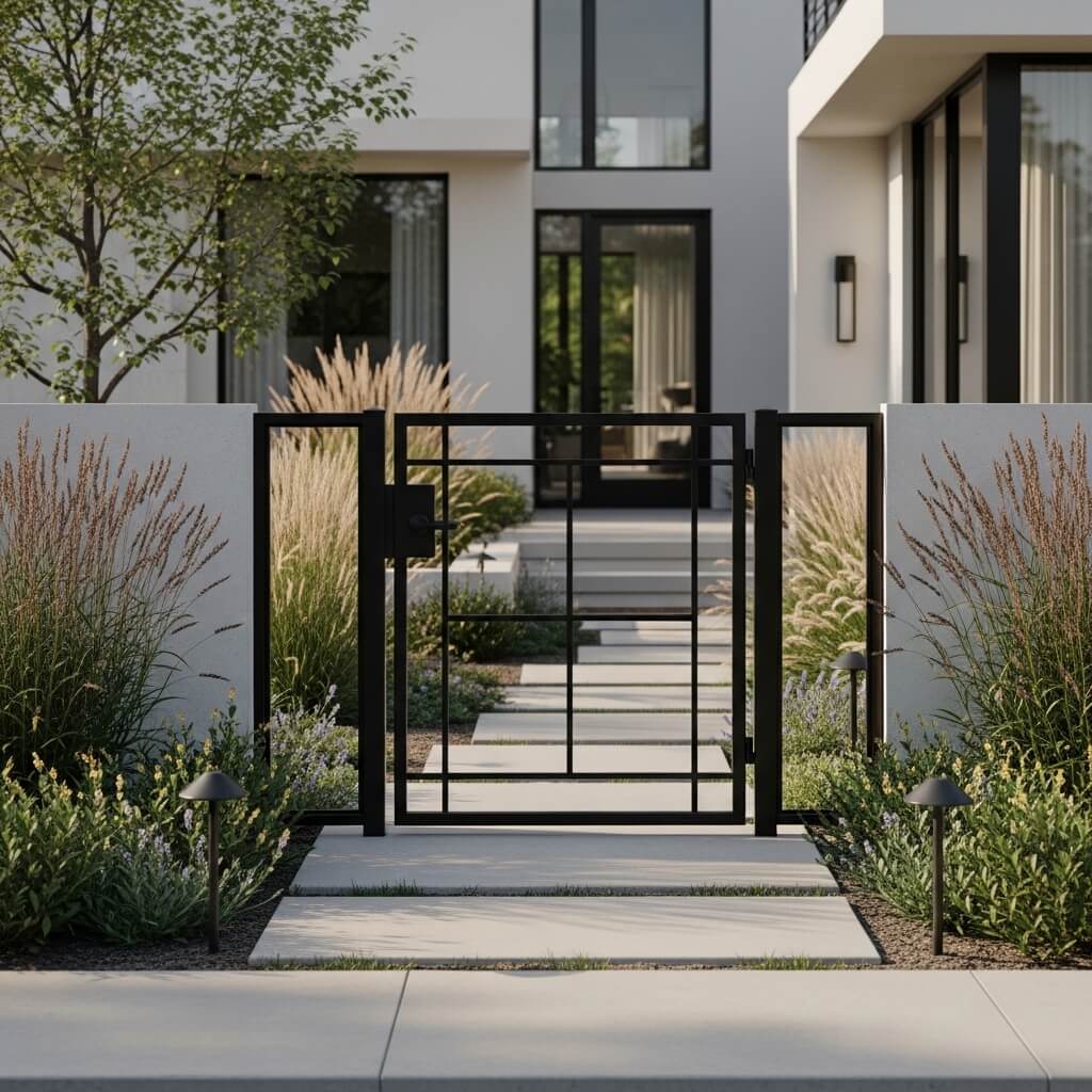 Want to add a touch of warmth without compromising the clean aesthetic? Consider combining steel frames with natural wood inserts. Just make sure you choose a wood species that can handle your climate – nobody wants a gate that looks like it’s having an identity crisis after one rainy season.