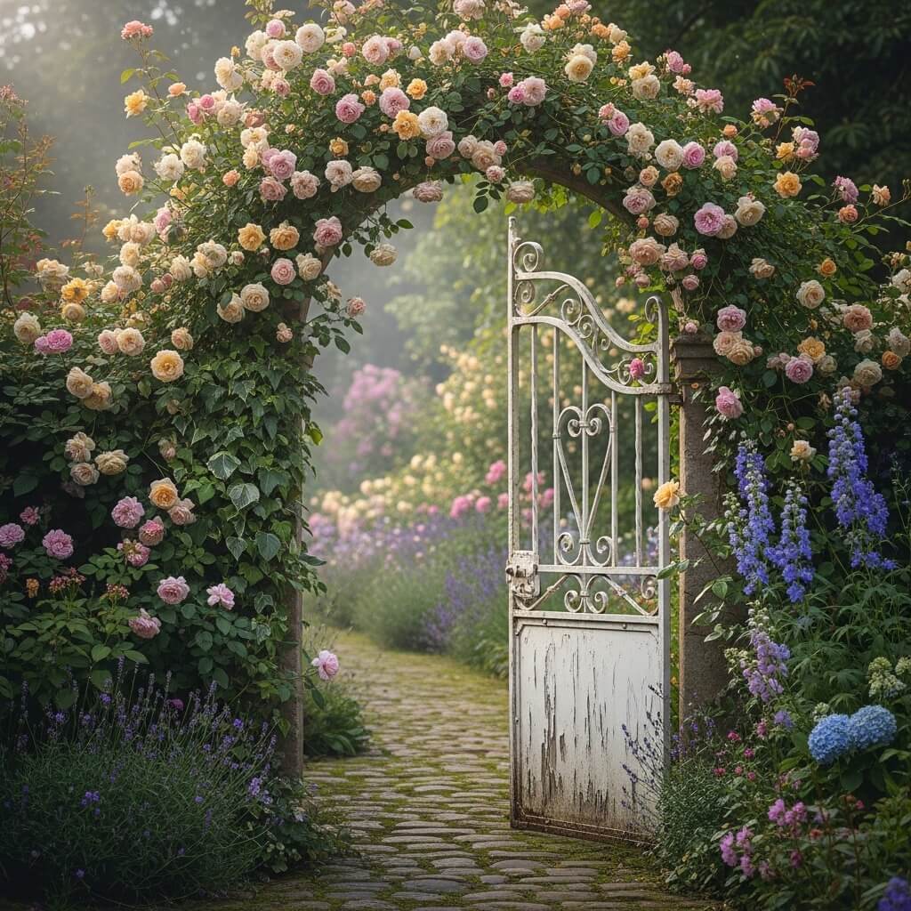 Climbing plants are non-negotiable for authentic cottage charm. Train roses, clematis, or jasmine up and around your gate structure. Yes, it means more maintenance, but the payoff is enormous. Nothing says “cottage garden” like having to gently move aside fragrant blooms to unlatch your gate.