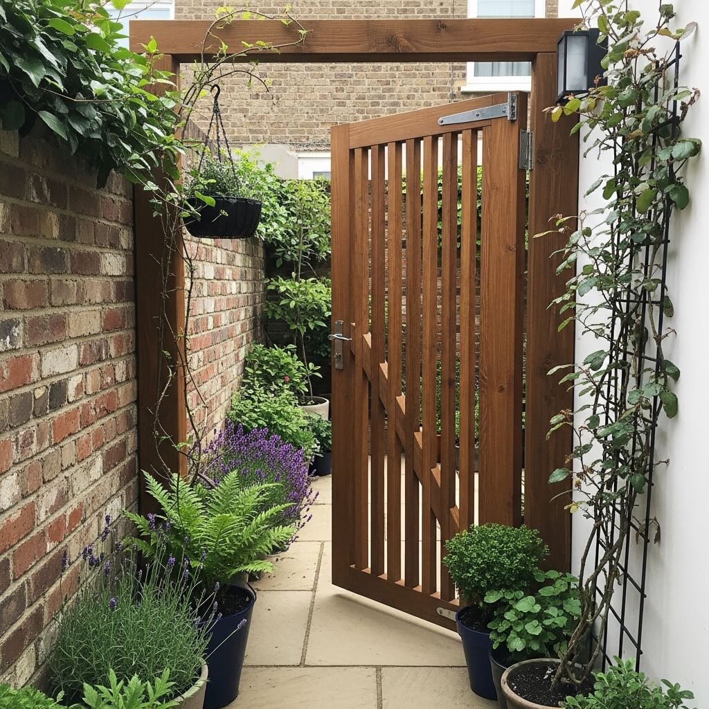 Vertical emphasis is your secret weapon in small spaces. Tall, narrow gates with vertical slats create the illusion of height and make your garden feel more expansive. You can also play with alternating slat widths to add visual interest without taking up precious real estate.