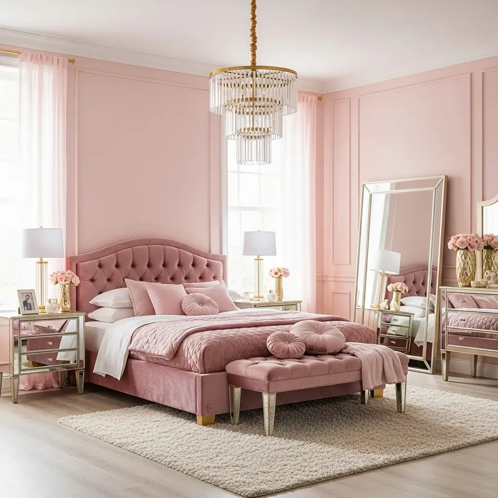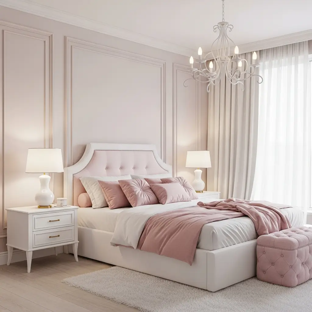 - Refined Textures: Use high-quality bedding in crisp white cotton or linen, layered with velvet or silk pink throw pillows.