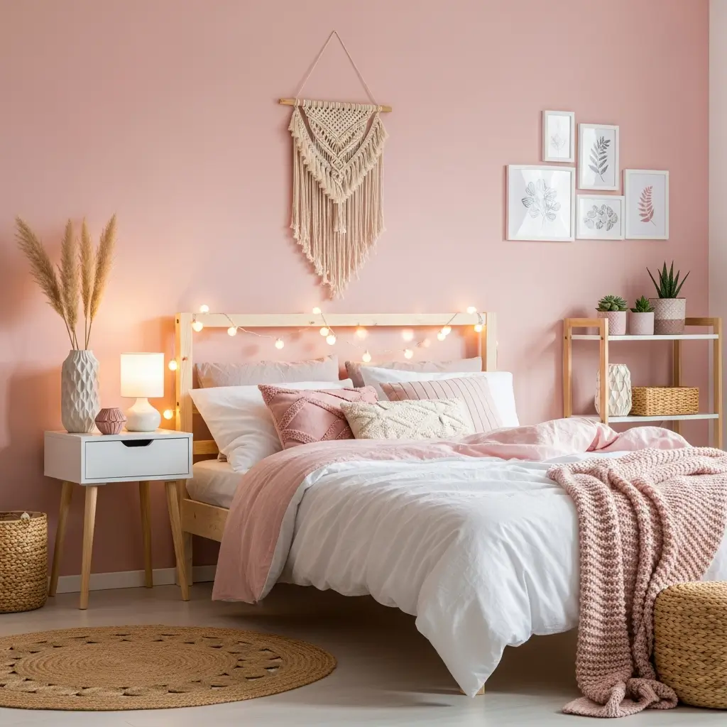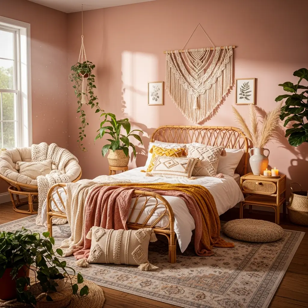 - Layered Textures: This is crucial for boho. Think macramé wall hangings, woven jute rugs, chunky knit pink blankets, and linen bedding.