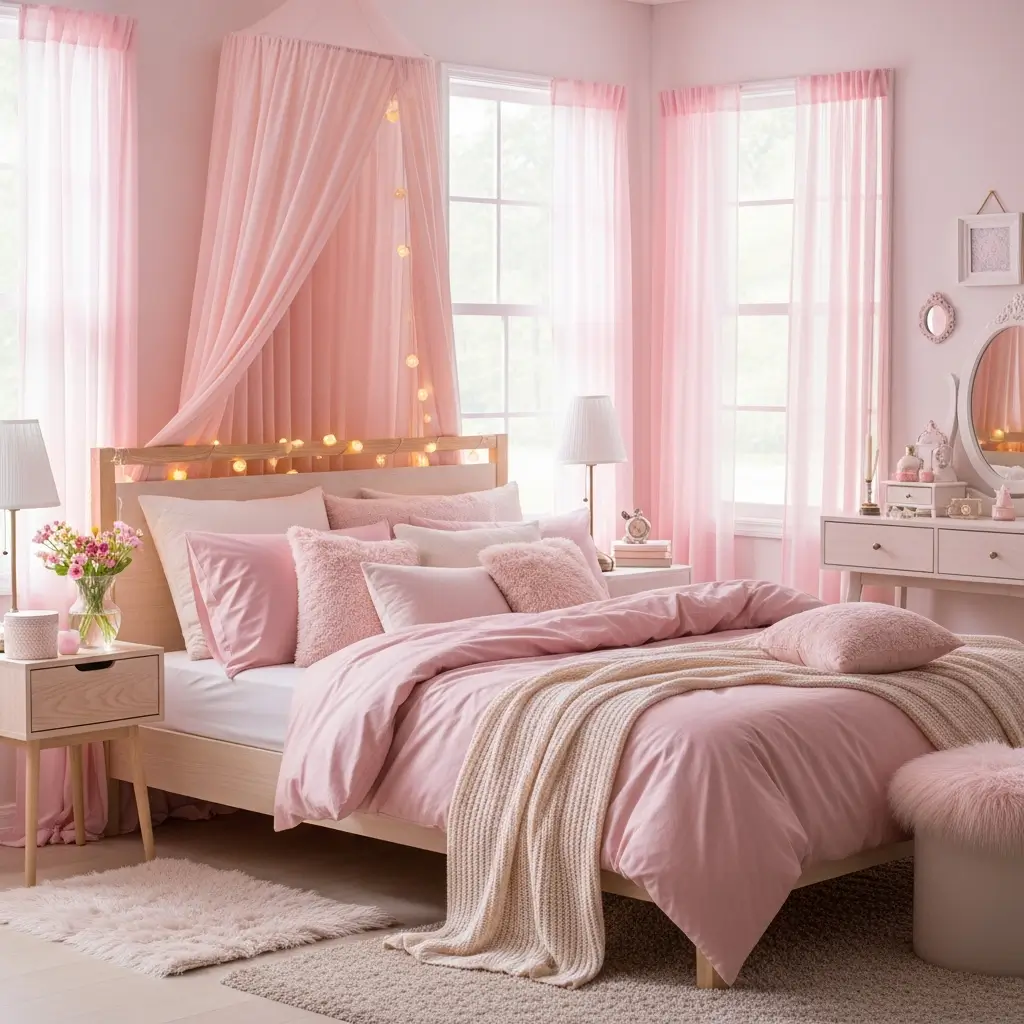 - Strategic Textiles: Prioritize pink bedding as your main splurge. Then, use affordable pink throw pillows and blankets from discount stores to layer.