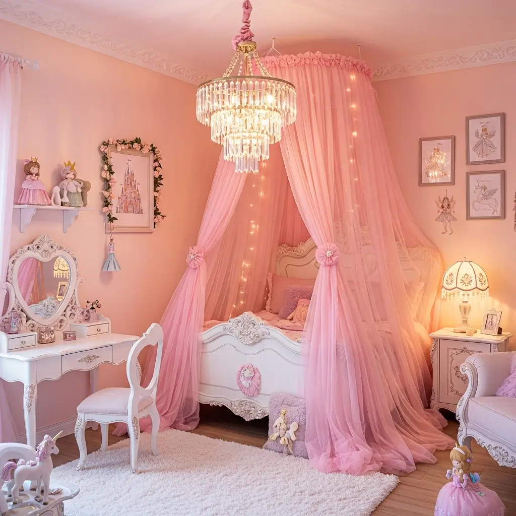 - Canopy Bed: A four-poster bed with sheer pink or white drapes is the ultimate princess centerpiece.