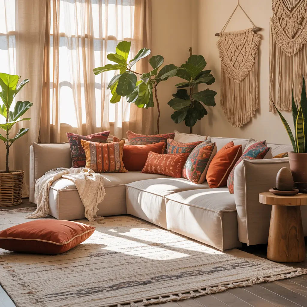 • Pillows: Mix and match patterns fearlessly. Use mudcloth prints, macramé textures, and maybe a few velvet cushions in rust or mustard.