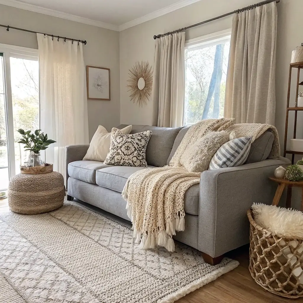 If you want your living room to feel like a big, warm hug, the Boho (Bohemian) route is calling your name. The key to styling a gray couch in a Boho setting is all about softening those cool gray tones with organic textures and warm colors. Since gray can sometimes feel a bit stiff or corporate, we need to introduce some “organized chaos” to bring it to life.
