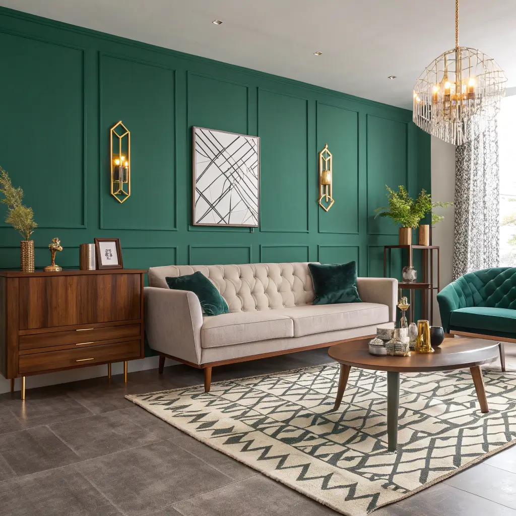 What makes this pairing so modern is the contrast between emerald’s jewel-like intensity and walnut’s organic warmth. It’s unexpected in the best way – luxurious without being stuffy, natural without being rustic. Every time someone sees my emerald accent wall with walnut furniture, they do a double-take in the good way.