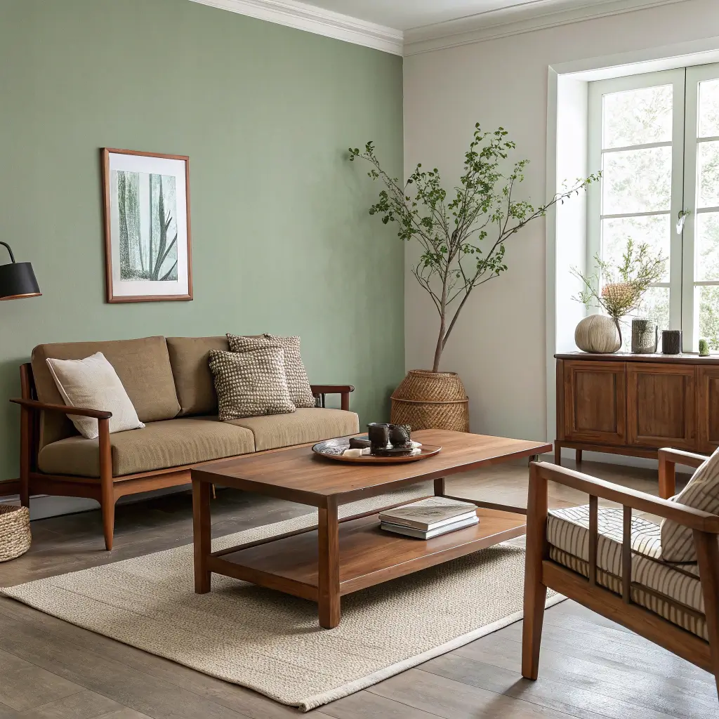 This combination works because both colors can function almost as neutrals. Sage brings life without loudness. Mocha adds warmth without weight. Together, they create a minimalist space that feels inhabited rather than abandoned.