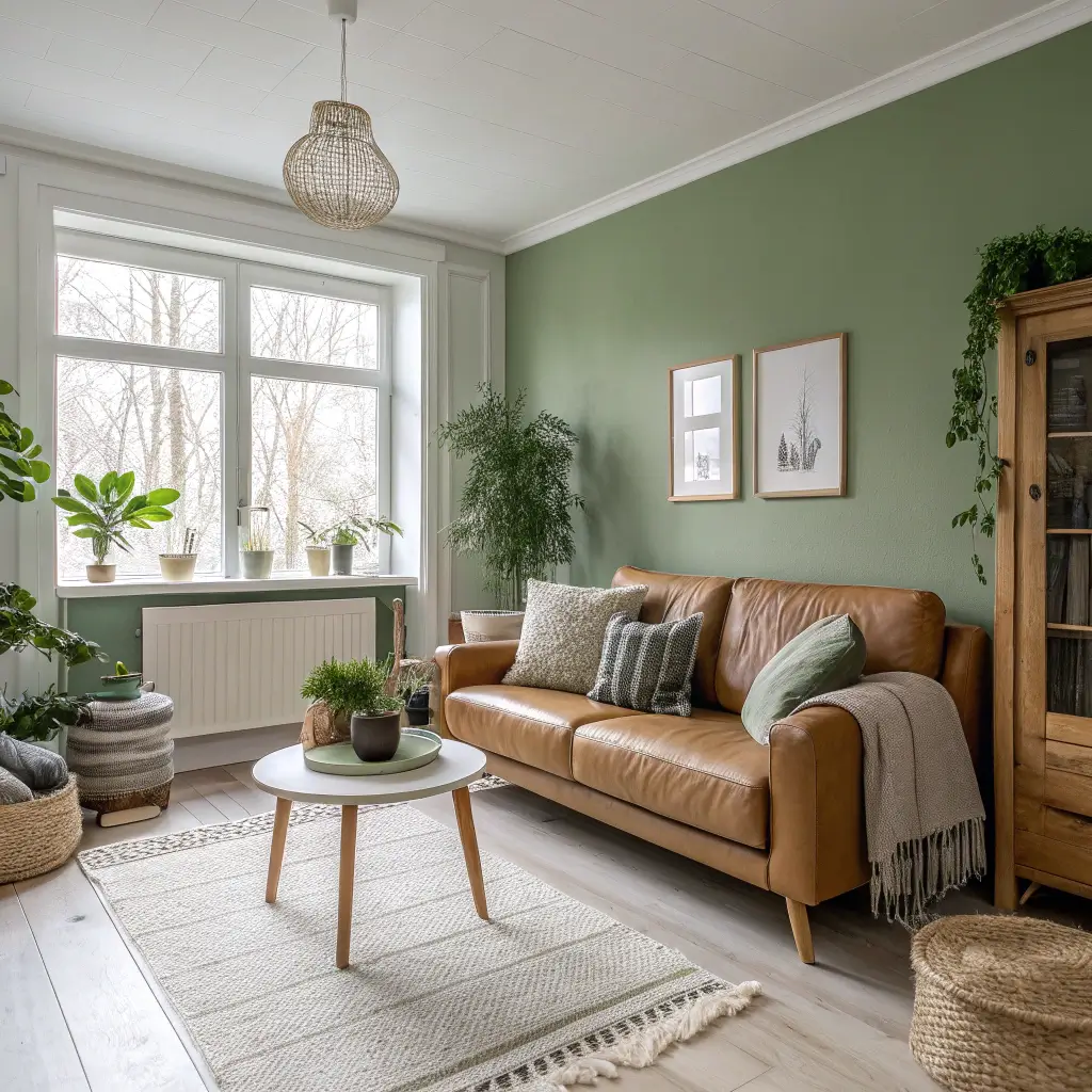 Layer neutrals between your green and tan. White, cream, light gray – these create breathing room and maintain that airy Scandinavian feel. Without them, even muted earth tones can feel heavy in this style context.