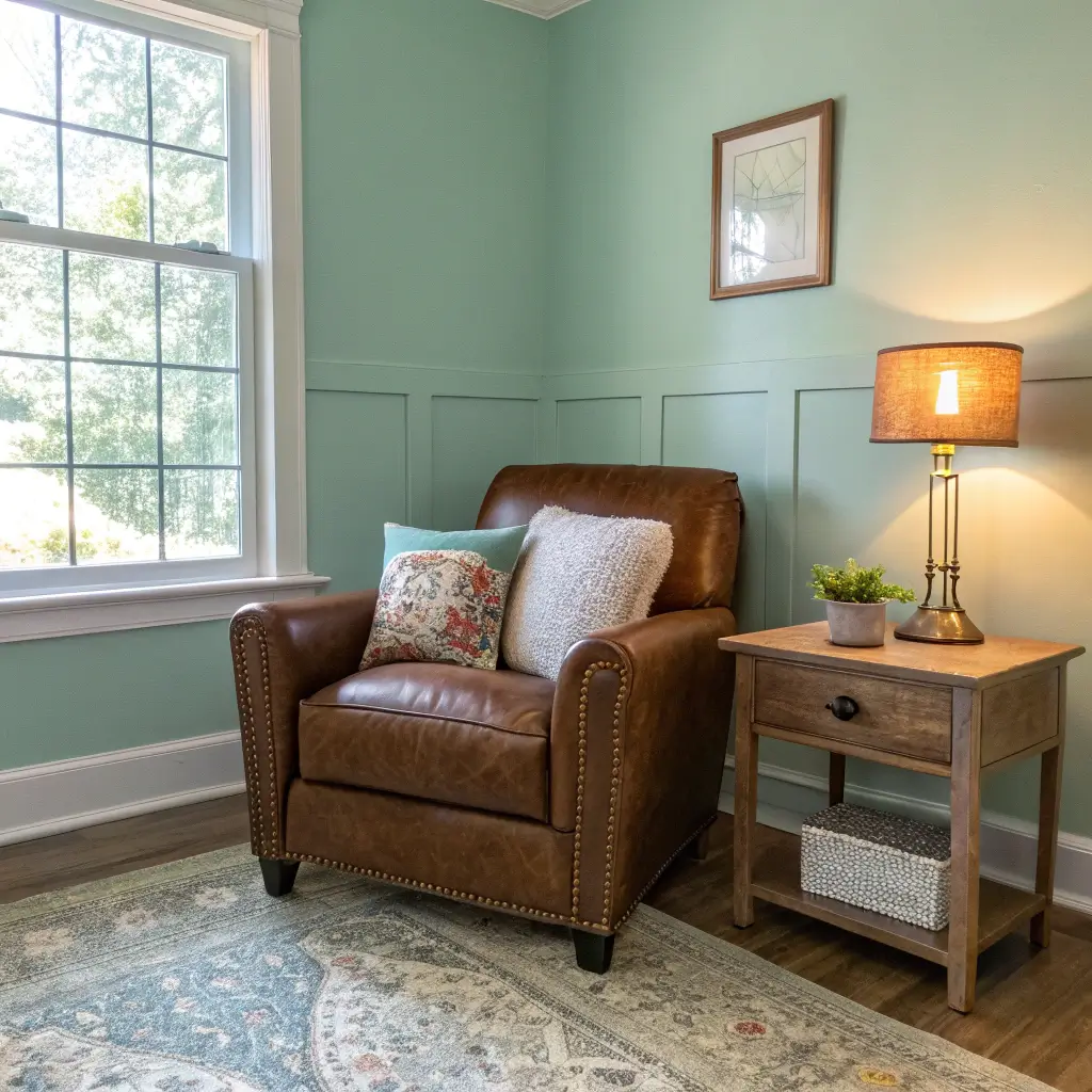 Layer textures to enhance coziness. Soft mint throw pillows on brown leather, a nubby brown blanket against mint walls. These tactile elements invite touching and lingering, which is exactly what cozy corners should do.
