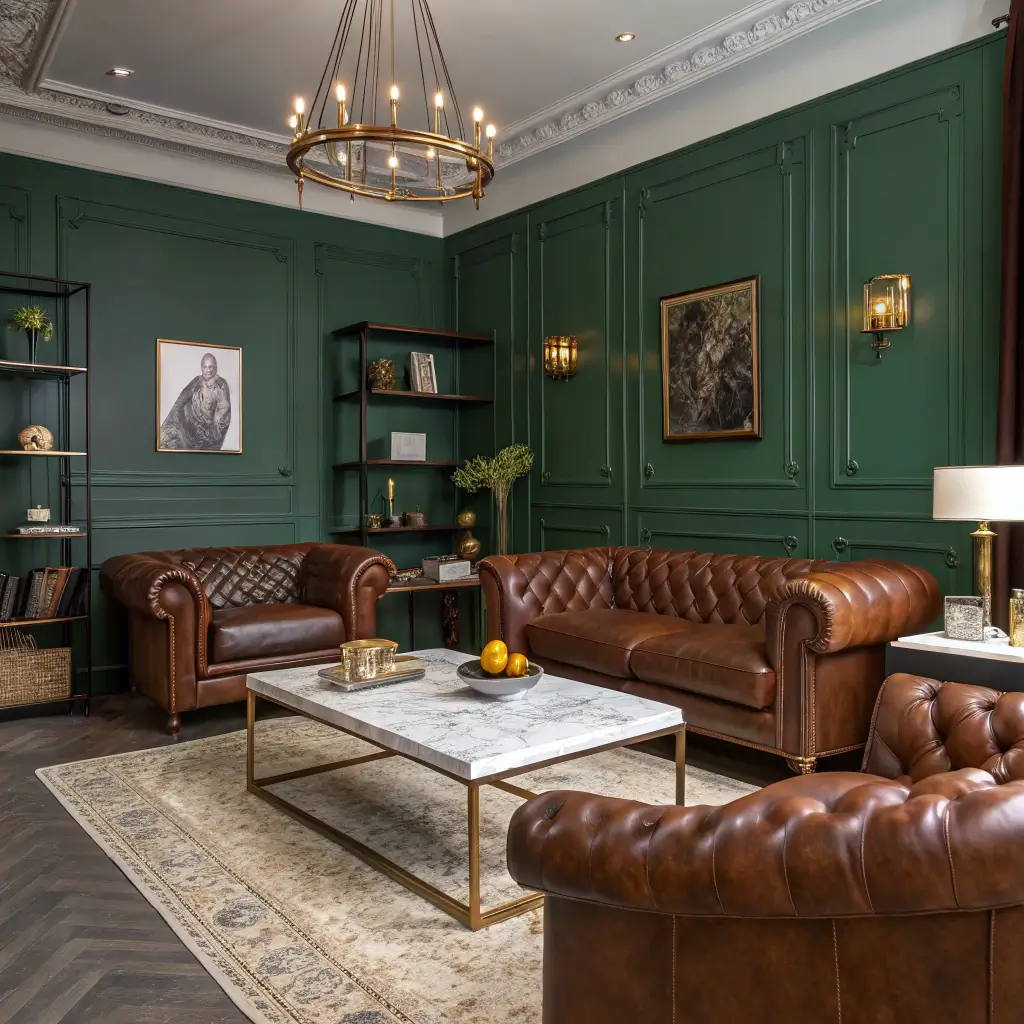Add metallic accents to catch and reflect light. Gold, brass, or copper work beautifully with dark green and brown. These touches prevent the space from feeling too heavy while adding to the luxurious vibe.