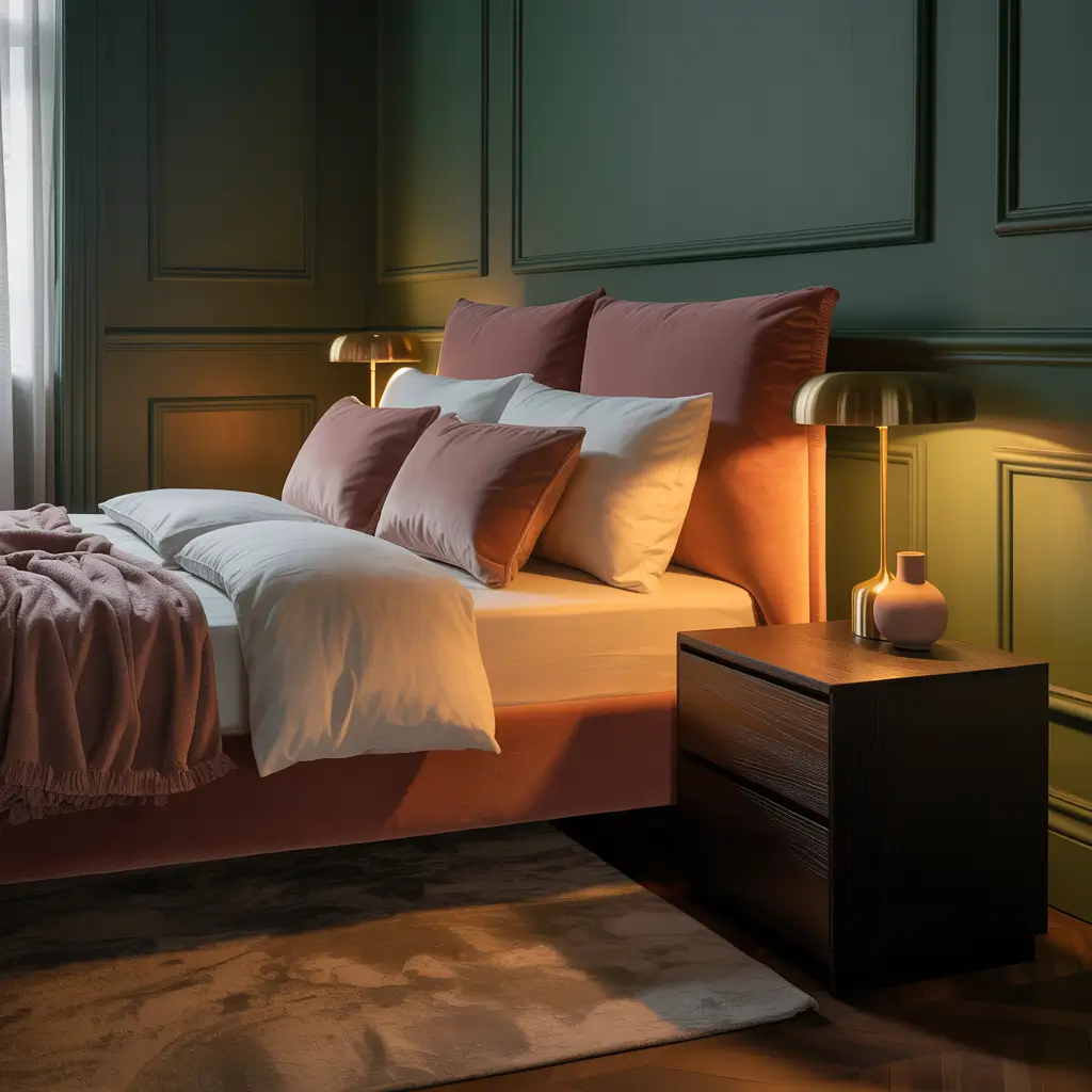 Talk about making a statement! A blush pink upholstered headboard becomes the star when surrounded by deep green accessories. I splurged on a tufted pink headboard last year, and pairing it with emerald green curtains and throw pillows transformed my entire bedroom vibe.