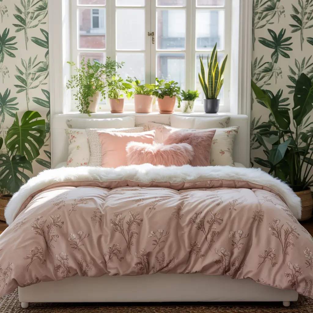I went all-in on this theme last summer, mixing pink peony bedding with green palm print curtains and botanical wall art. The trick is choosing patterns that complement rather than compete. Think of it as creating a cohesive garden scene rather than a pattern clash.