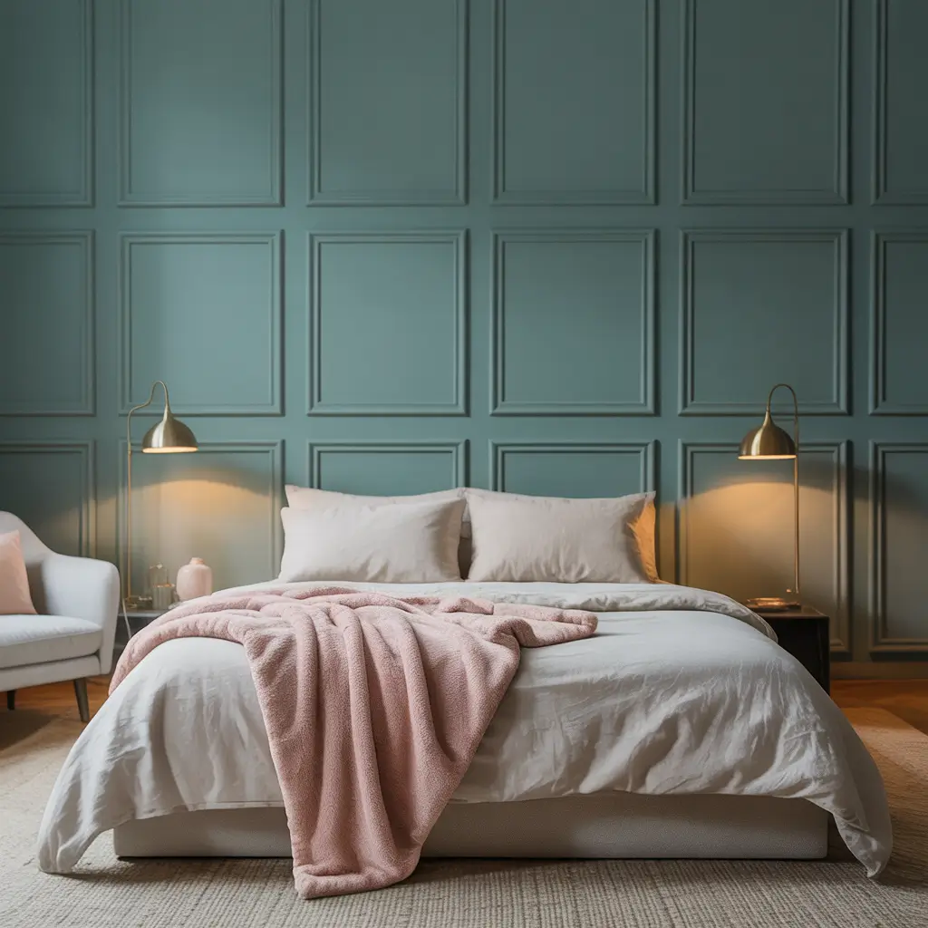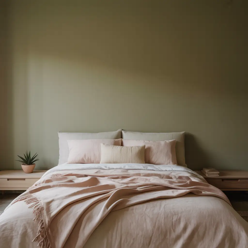 Sometimes subtlety wins, and earthy green walls with soft pink bedding creates the perfect balance of grounding and softness. This combo makes me think of sunrise in a forest – natural, peaceful, and quietly beautiful.